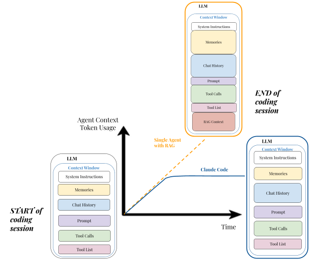 A line graph showing Agent context token usage over a long coding session for a single-agent, RAG system linearly filling its context until truncation (broken, orange line) & Claude Code's sub-agent system maintaining a relatively flat context in the supervisor agent, while using ephemeral, parallel sub-agent contexts.